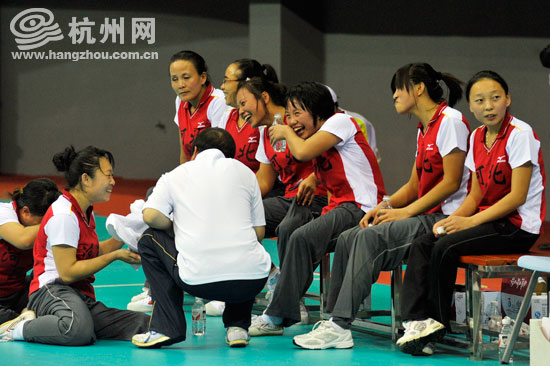 暂停时,河北队的主教练并没有训斥,相反却和队员们乐成了一片。