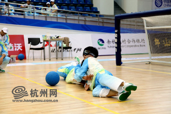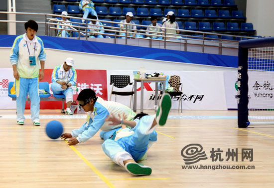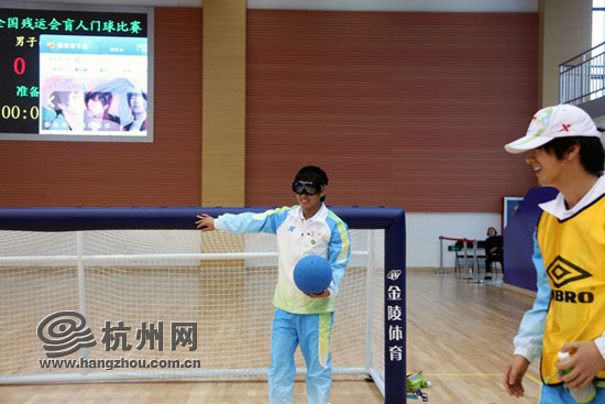 “别看这个球摸着跟橡皮一样,拿在手上可沉了,打在身上那就更痛了。”“小浪花”李江兵摸着自己受伤的手肘说道。蓝色的门球里面装有铃铛,蒙上眼睛后完全是靠听力和触觉分辩。我们的“小浪花”连走路都无法保持平衡,更别提分辨球的来路了,自然比赛结果也是“惨不忍睹”。