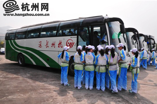 杭州网讯 10月10日中午12点,杭州长运东南公司的4辆豪华大巴车整齐地停在浙江长征职业技术学院门口。他们将运送130名志愿者和7名工作人员前往黄龙体育馆,参加第八届全国残运会开幕式彩排。