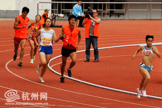 女子800米比赛中,图右的选手在最后200米放开引导员,独自向终点冲刺。