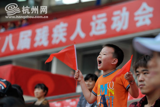 这位小朋友挥舞着小红旗,高喊着“加油”为每一位运动员助威。