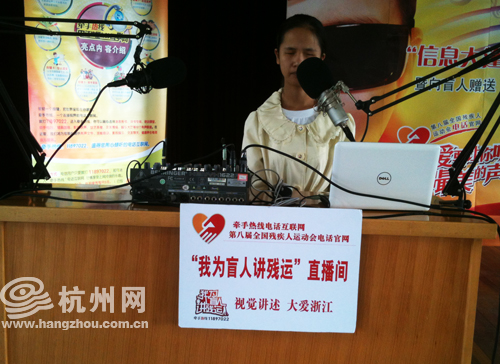 “牵手热线”的盲人记者董丽娜正在现场连线残运会赛况