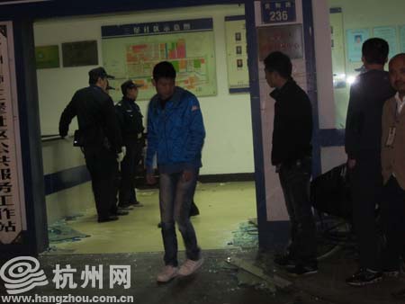 杭州网记者核实报道:事发时间是今天凌晨2点左右,网友老朱说,当时警务室的玻璃门被砸的粉碎,地上到处散落着玻璃碎片。