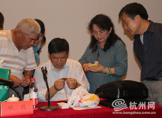 讲座过后,姚老把自己的心爱之物拿出来给大家传看,有良渚玉琮,有和田玉摆件,来宾们可谓是一饱眼福。紧接着,大家也都纷纷拿出自己的“宝贝”,请姚老帮忙鉴定真伪。