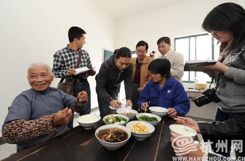 走进横埂头村,文化气息引面而来,以孝文化为主的文化墙,以群众娱乐生活为主的文化中心,以学习为主的图书馆,特别值得一提的是村庄旁一幢独立的洋式小楼,这是村里为家中四代同堂的老人安排的过渡房,也是老年公寓。我们采访团走进其中一户人家,75岁的仲杏花正在和两个女儿用餐。仲杏花笑着说没想到年纪大了还能住上新洋房,全靠党的政策好,这里住的都是同村的老人,平时不愁聊天的伴,早上起来照顾下门口的自留地,中午女儿下班就来和她共进午餐,日子过得好着哪!