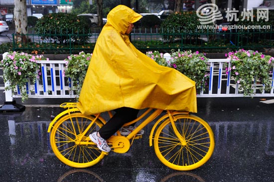 体育场路上,有位市民穿着黄雨衣,骑着一辆连轮胎都漆成黄色的自行车。