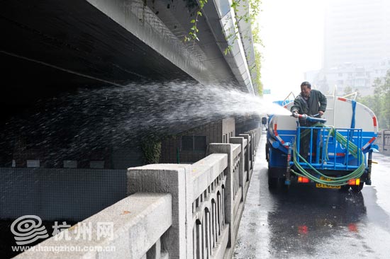 园林工人正在给中河立交桥下的绿化植物浇水——尽管下了好几天雨,但桥底下可没淋到。