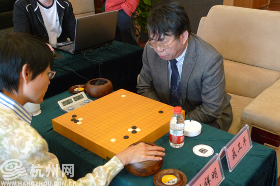 11月3日下午3时,著名棋手马晓春赶赴杭州,在中国棋院杭州分院与本届“商业杯”冠军韩国首尔队队员李尚宪进行了手谈,围棋元老华以刚和华学明在现场挂大盘讲解。 |