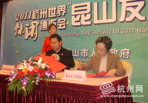 11月9日晚,杭州市休博会组委会办公室副主任施永胜与昆山市人民政府副市长金乃冰,共同签署了关于昆山市政府与杭州市西湖博览会组委会、杭州世界休闲博览会组委会建立长期合作关系的备忘录,确定将昆山市作为杭州西博会、休博会的分会场。