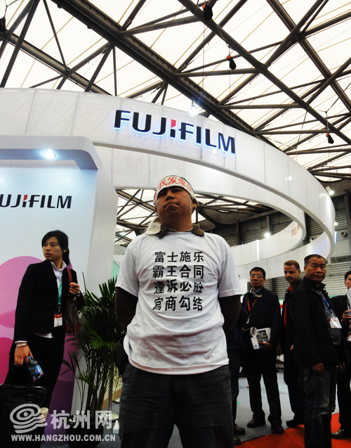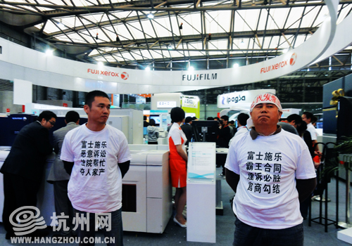 在全印展现场,几位身穿白色T恤,头上系着白色布条,布条上面写着“富士施乐还我发票”的老客户在会场抗议示威。