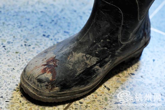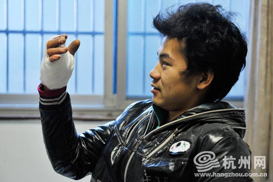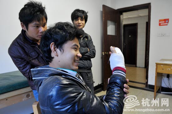 伤者叫练吉明,23岁,广西人。他和练明华等几位同村人一起在三墩的中海地产工地打工。练明华说,事故发生在早上8点,随后几位老乡马上把练吉明送到了医院。