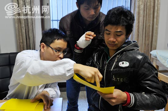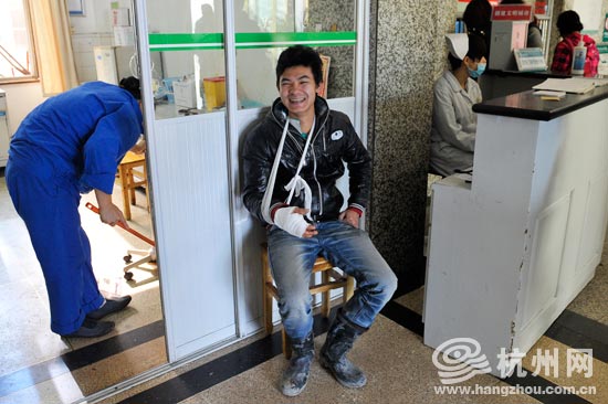 刚处理完伤口,练吉明就说要回去,在医生劝说下坐在凳子上休息,一边还和工友开着玩笑。这是一个大大咧咧的小伙子。