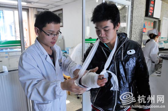 在急诊室门口,医生给练吉明的右手挂上绷带。