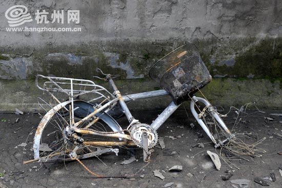 一辆烧得变形的自行车。