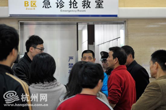 抢救室门口,小余的父亲(图右红衣男子)正焦急地等待。