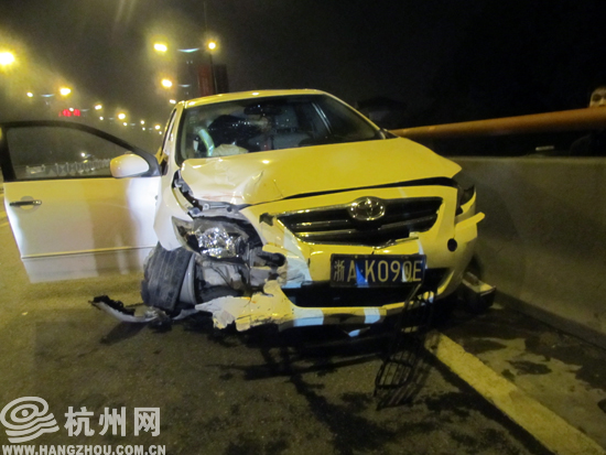 现场的目击者说,丰田车是自西至东行驶的,快到下桥口时,突然左转撞断中央护栏,后又冲到对向车道上,最后撞上了上桥护栏才停下。
