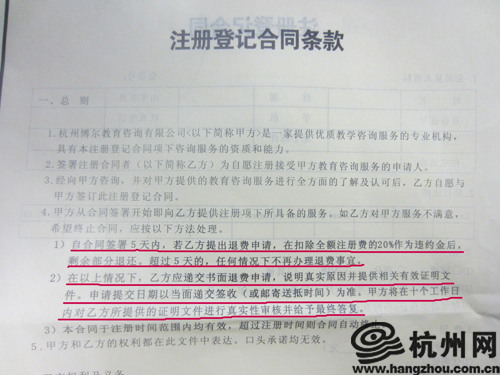 继杭州网记者11月7日报道了《杭州博尔英语退费难》之后,近日,杭州网记者再次接到一位学生家长打来电话投诉:“我在杭州博尔外语帮孩子报了个英语学习班,课还没有开始上,现在要退费就困难了。从5月份就申请要求退费,一直等到今天,也没有结果,每次博尔外语方面说,要想退费是不可能的。我认为这样的教育机构制定的合同认为就是霸王条款。”