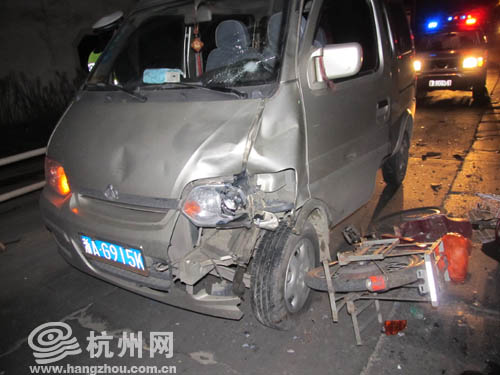 杭州网记者核实:事发时间是凌晨5点左右,航海路561号附近,面包车当时是由西往东方向行驶,迎面撞上了逆行的电动车。