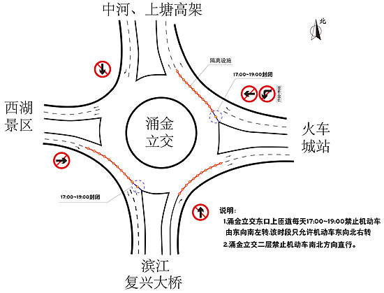 ●中河—上塘高架涌金立交二层由南向北、由北向南禁止机动车利用涌金转盘实行南北方向直行。