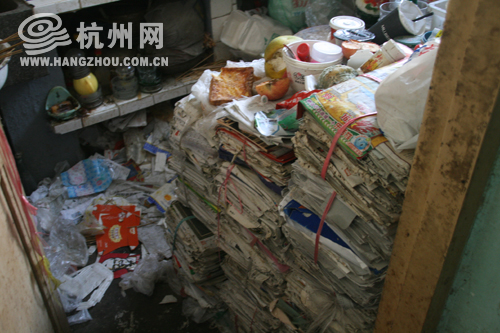 门开后,老人只同意杭网记者和民警进入,正对门的阳台上堵满了很多杂物,有泡沫饭盒、塑料袋、旧报纸、瓶瓶罐罐,种类还真多,阳台只能容纳一个人通过,客厅桌上的食物已干的发硬,碗里的食物也已霉变,老人说,这是给狗狗吃的。每个屋子都堆满了这样的杂物,厨房的报纸堆的已经超过灶台,整个屋里没有一块干净之地,味道重的让人有点窒息。