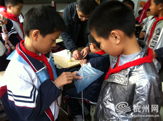 杭州网讯 一块两个巴掌大的白色真丝布、数根竹篾丝,在陈永联娴熟的左粘右画之下,不一会儿工夫,一只漂亮的微型风筝成形了。紧接着,讲台下跃跃欲试的孩子们也都纷纷拿起桌上早已备齐了的材料工具,跟着陈老动起手来。