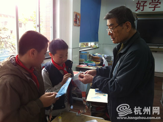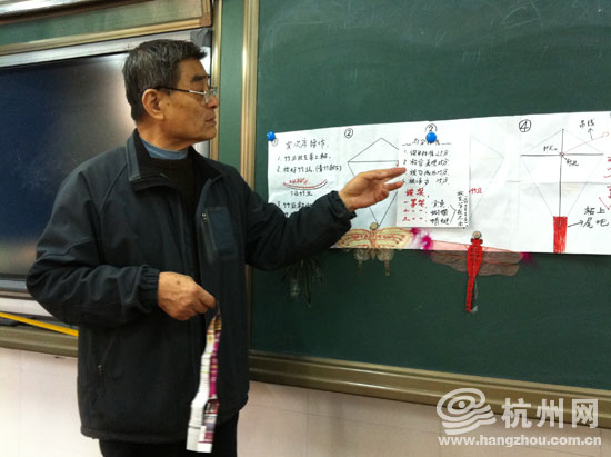 此刻,陈老正站在杭州运河学校的一个班级讲台上,一边给学生们做现场示范,一边耐心的解说着每个制作步骤和要领。当看到有孩子脸上挂着疑惑、不解的神情时,陈老便赶忙走到他身边,手把手的指导如何制作完成一只风筝。