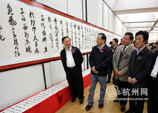 宋涛(右一)陪同市政协主席孙忠焕(右二)参观书法艺术展。