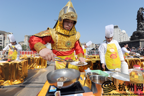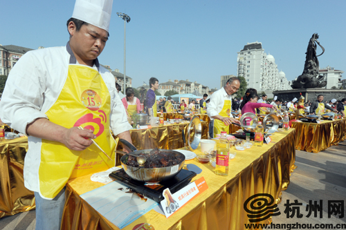 11月27日下午,“我最喜爱的十佳杭帮菜”评选暨“杭帮盛宴·民间厨神秀”在杭州西城广场与运河广场同时启动。活动现场共支起了100副锅灶,百名准厨神同时开锅,现场比拼厨艺,向杭帮菜“民间厨神”称号发起挑战。