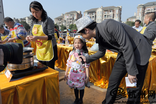 身穿Hello Kitty围裙的雪儿,是现场烧菜比赛中年龄最小的参赛者。尚不满6岁的她,比锅灶高不了多少,却有板有眼地往鹌鹑蛋里放着胡萝卜末,信心十足地准备着“兰花蒸蛋”。