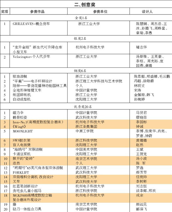 2011“创意杭州”工业设计大赛创意奖获奖项目名单