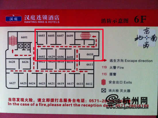 记者在墙上找到了六楼房间的分布图,从图上看,推测出事的应该是6602到6610中的某一个房间,但由于工作人员的阻拦,记者无法靠近现场。