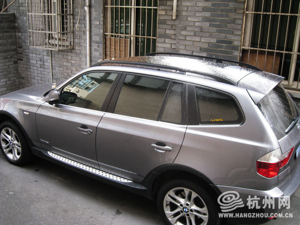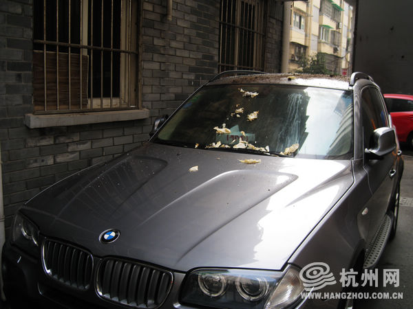 今天下午,记者来到“案发现场”——位于解放路天工艺苑背面的南班巷小区21幢1单元楼下。一辆银灰色宝马车越野车依旧停在现场。记者看到,宝马车的前挡风玻璃上,覆盖着一些吃过的柚子皮,车顶上则是一些棕色的泥土和类似石灰的白色物质。