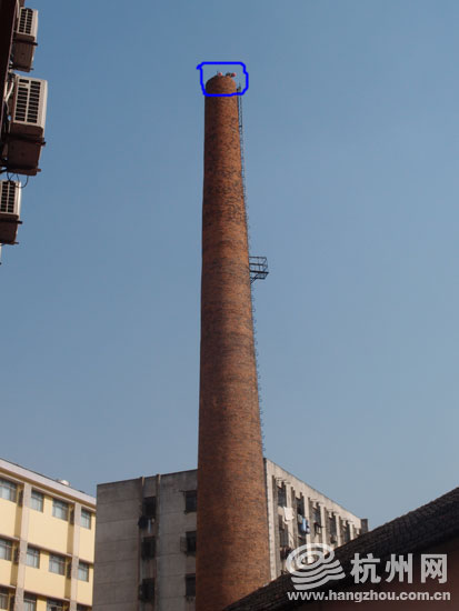 今天在拆除现场,记者看到了这根约10层楼高的烟囱。电钻的声音从烟囱顶传来,隐隐约约看到烟囱顶上冒出两个带着安全帽的工人。