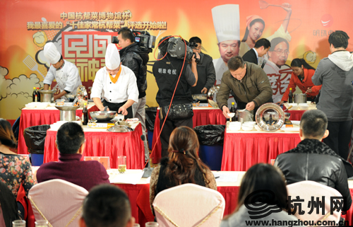 30位选手共分6组,从香干肉丝、腐皮青菜、杭三鲜、糖醋排骨、炒二冬、酱三丁6个菜中挑选一个现场烧制。而本次邀请到的评委都是资深“吃货”,几乎把杭州媒体中与吃有关的记者、编辑都请到了现场。