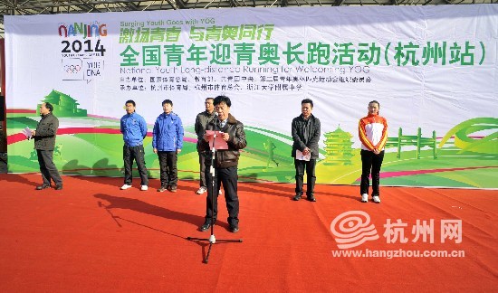 杭州网讯 12月24日下午,黄龙体育中心西侧广场彩旗飘扬、热闹非凡——气球、拱门、横幅、巨幅背景以及欢快的音乐营造出了一片喜庆的氛围。来自杭师大、钱江学院、市团校等7所高等院校的1500名青年师生,冒着严寒参加了由由国家体育总局、教育部、共青团中央和南京青奥组委会主办,杭州市体育局、体育总会承办的“全国青年迎青奥”长跑活动杭州站启动式。