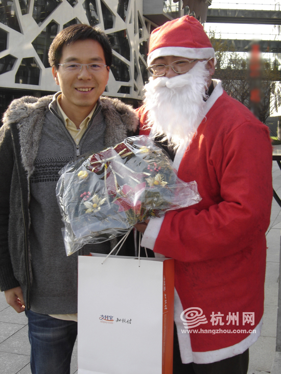 在滨江区工作的袁先生收到爱心圣诞礼物时笑容十分灿烂。