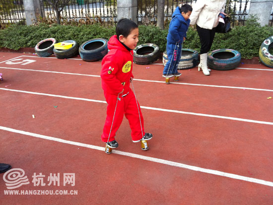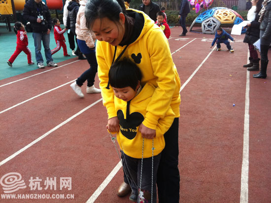“高跷”比赛,小朋友们紧张地进行着,父母则站在终点高喊着“加油”。
