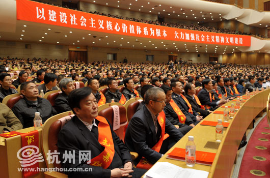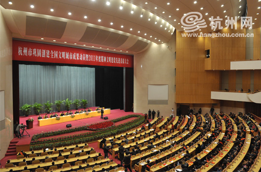 今天在这里,杭州市隆重举行巩固创建全国文明城市成果动员暨2011年度精神文明建设先进表彰大会。伴随着欢庆的锣鼓声,全国文明单位、全国文明村镇、杭州市创建全国文明城市工作先进集体以及先进个人的代表,通过红地毯迈入大会堂,他们成为了此刻聚光灯下的明星。