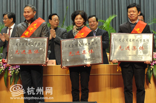 市领导为全国文明单位、全国文明村镇、杭州市创建全国文明城市工作先进集体以及先进个人的代表颁奖。杭报集团荣获先进集体。