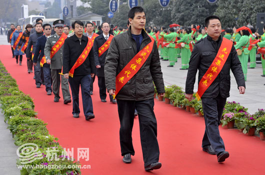 杭州网讯 今天上午,在省人民大会堂前的广场上,一条被鲜花簇拥的红地毯从广场中央一直通向了大会堂。这场红毯秀的主角既不是娱乐明星,也不是商界大佬,而是生活在杭州这座城市的许许多多普通人。