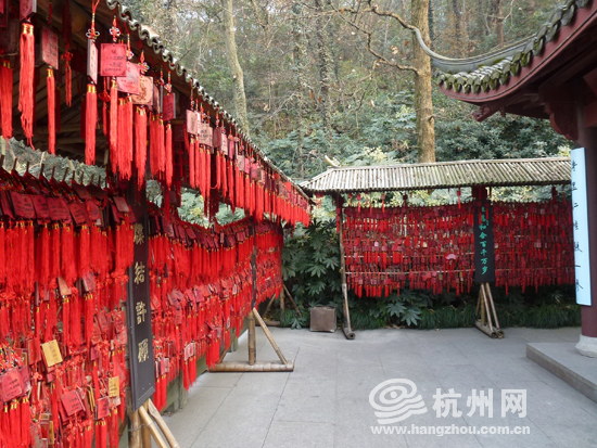 书院落在凤凰山北万松岭上,周围柏松环绕,清静悠远,虽然处于闹市边,却是闹中取静,非常适合都市人沉淀浮华的需求。有三两学子前来郊游散步,对着书院内的名士雕像侃侃而谈;也有年轻的父母带着孩子,期望能让孩子感受到一些书院的灵气。在书院供奉孔子的大成殿外,立着四面许愿墙,上面挂满了承载万千寄托的红牌,大多是求“学业有成”的心愿。