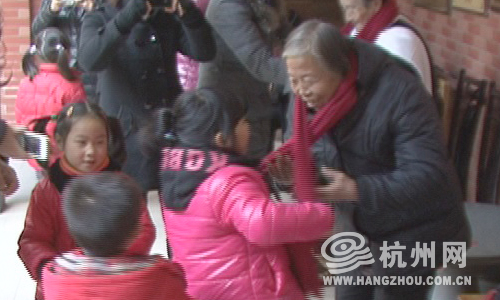 最后,小朋友们还来到西湖区转塘街道养老院,给这里的爷爷奶奶们送去了新年的祝福。瞧,一张张大红福字,一条条暖暖的围巾,还有小朋友亲手做的新年贺卡,无不温暖着老人们的心。