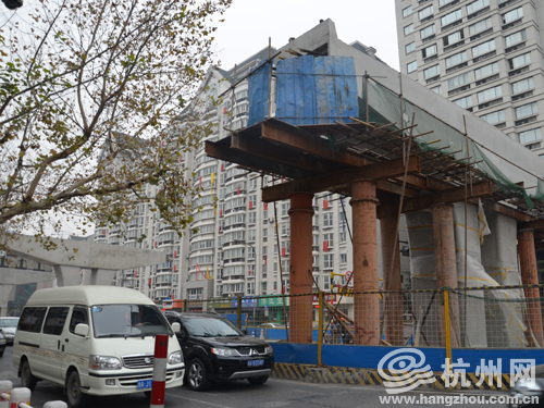1月6日下午,记者来到了位于德胜路和湖墅南路交叉口的施工现场。几名建筑工人正在从石墩上方忙活着。