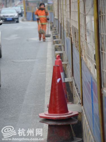 “昨天下午,他们工地的工人叫我拿几个隔离桩把平台下面的这段路给封上,说怕上面掉东西。原来这条路有两条车道,封了以后只剩一条了。”环卫工人王大姐说。