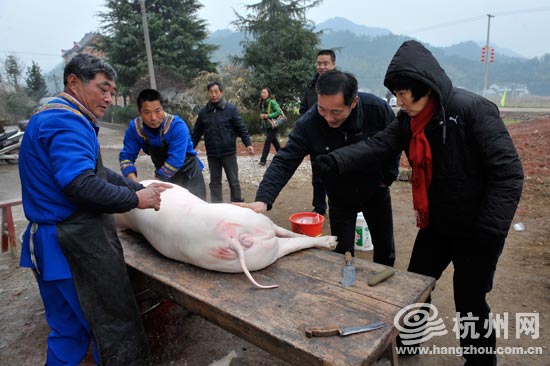 心急的市民早早地跑去观看杀年猪,等着分热腾腾的土猪肉。