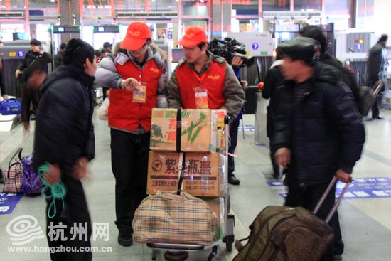 杭州网讯 “您好,别落了这件行李”,“您的候车室在二号候车室,前面直走右边第一个”,“车站售票大厅只卖3天以内的车票,对,就是后天的票。” 1月8日,随着春运工作的全面启动,由团市委、市春运办、市志愿者工作指导中心、市志愿者协会共同组织实施的春运志愿服务行动也在杭城各大火车站、汽车站全面展开。