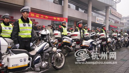 今天上午,由市公安局交警局联合市春运办、市交通局、市安监局等共同发起的春运交通安全集中宣传活动在汽车北站站前广场隆重举行,鲜艳的大红标语上写着“文明出行,平安春运”、“文明出行,杭州先行”。