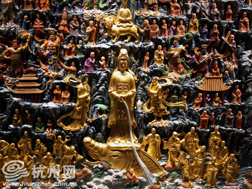 日前,由市工美大师邱润宝设计创作的彩金木雕《善财童子五十三参》在杭州工艺美术博物馆的木雕展区展出。彩金木雕是杭州传统工艺美术的保护品种,作品长3.2米,高2.6米,取材于《佛教故事海岛神仙图》,曾获得中国工艺美术百花奖一等奖。此次由杭州工艺美术研究所为博物馆重新制作。原料采用特级进口红花梨木,充分发挥深、浅浮雕工艺的效果,将150余尊服饰不一、神态各异的佛像雕刻在一幅作品。同时采用施金敷彩,以及将名贵的珍珠玛瑙、翡翠玉石等,以镶、嵌、贴等工艺进行装饰,色彩靓丽、雕工精致、栩栩如生,令人叹为观止。