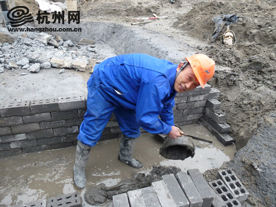 杭州网讯 头戴橘黄色的安全帽,身穿蓝色工装,脚套一双高帮绝缘靴,鞋上布满泥点,这就是砌筑工孙进华一整天的装束。简短有力的握手让人感受到掌心的粗糙及温暖,腼腆的笑容憨厚朴实。刚刚三十出头的年纪却已经有深深的皱纹爬上眼角。