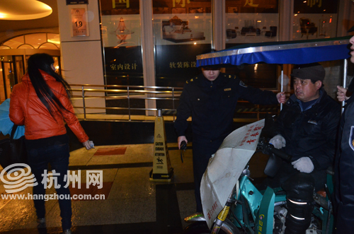 残疾车男子说是在武林广场拉上的乘客,到城站火车站坐车,下雨天打不到车,他就“帮忙”送了过来。